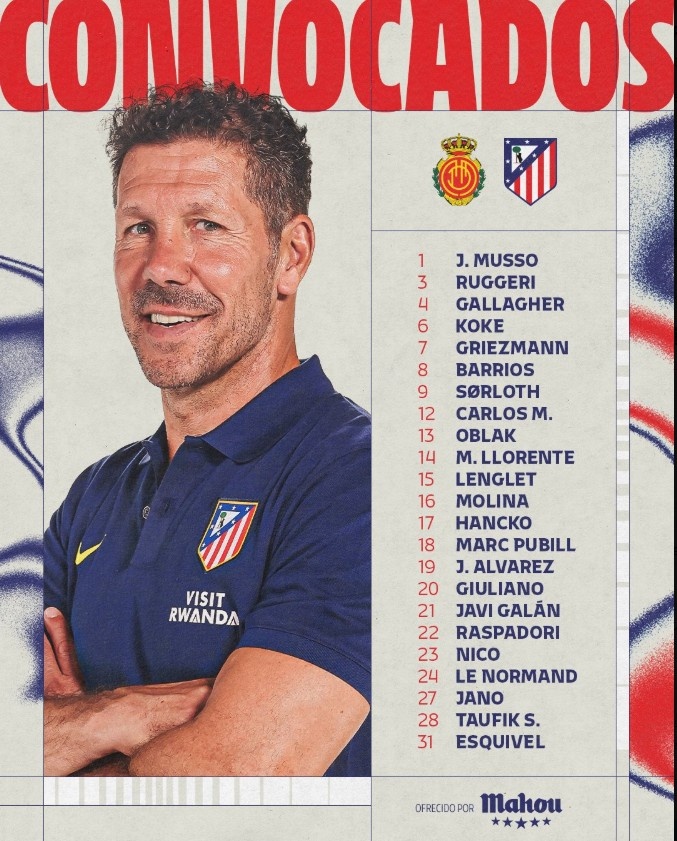 中场球员:3-鲁杰里、4-加拉格尔、6-科克、8-巴里奥斯、23-尼科-冈萨雷斯、7-格列兹曼、27-哈诺-蒙塞拉特、28-陶菲克