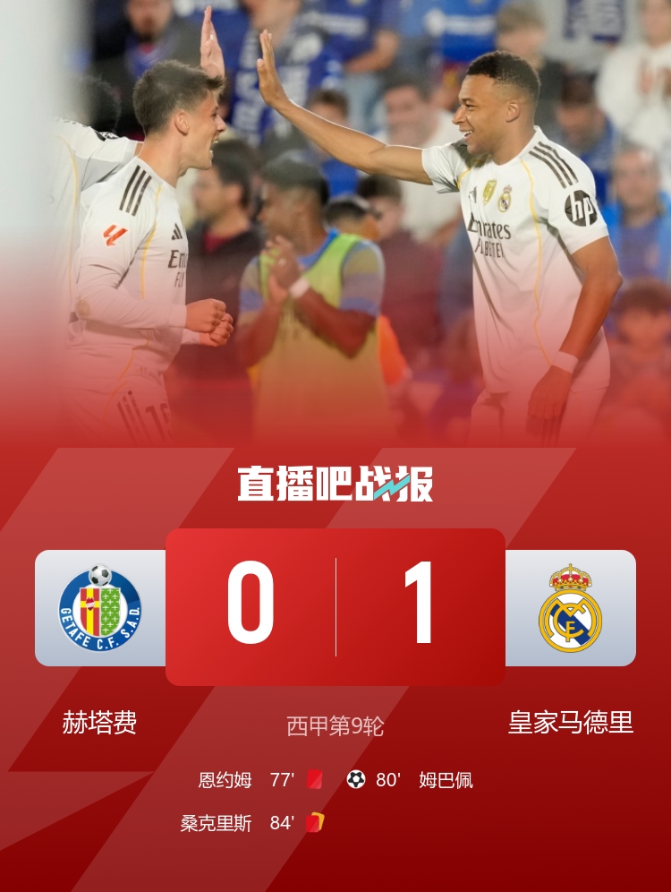 2分领跑!皇马1-0九人赫塔费 姆巴佩制胜维尼修斯后备 造两红