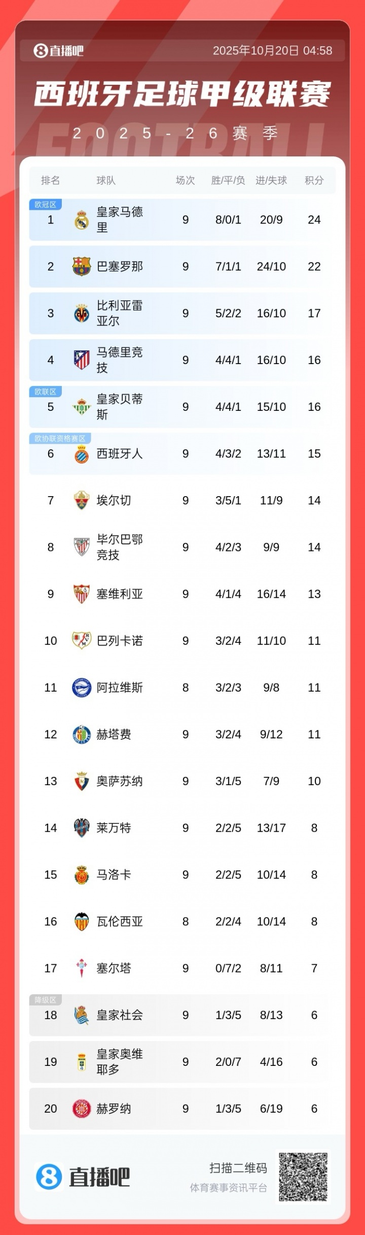 西甲积分榜:皇马2分优势领跑 巴萨,下轮国家德比