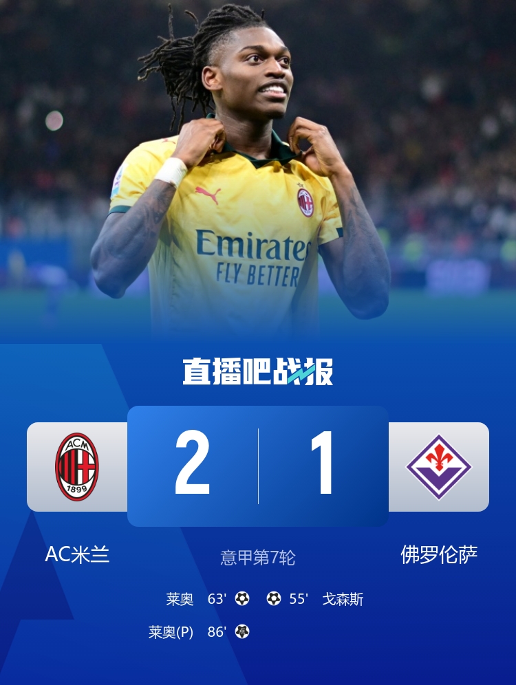 6轮不败登顶!AC米兰2-1反转 佛罗伦萨 莱奥连进两球希门尼斯造点