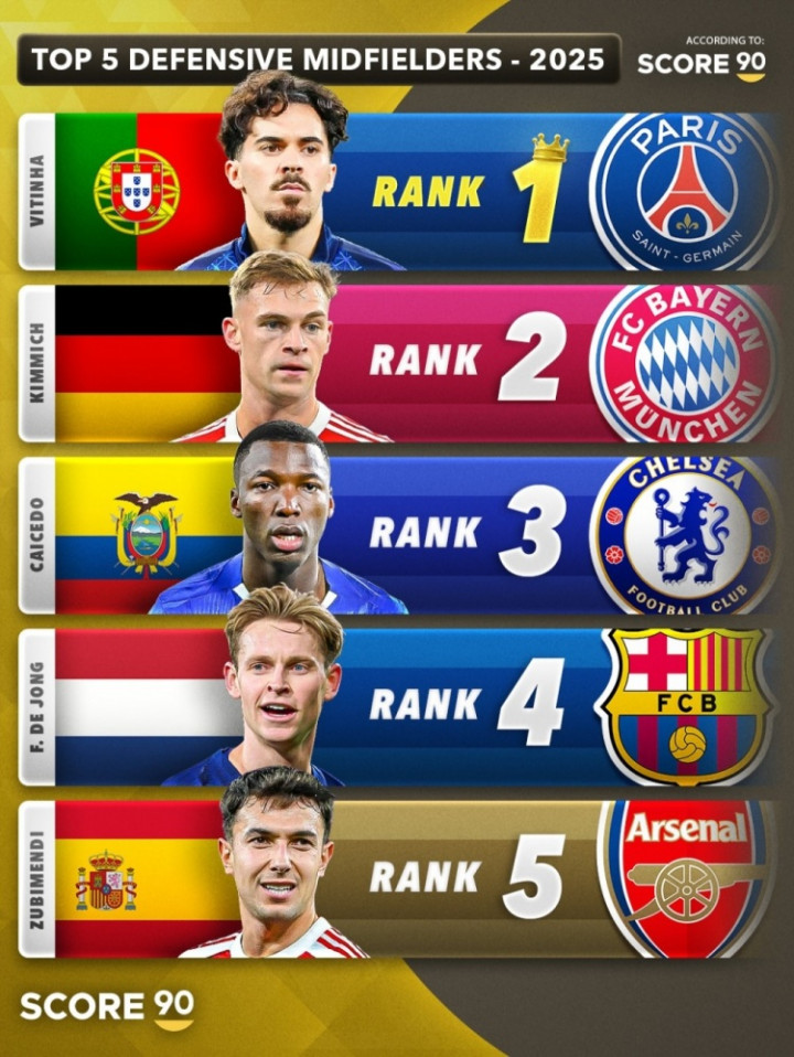 以下是2025年最佳防卫 型中场球员前五榜单: