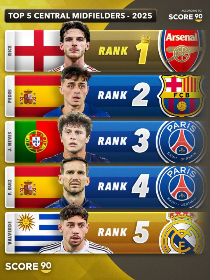 以下是2025年最佳中场球员前五榜单: