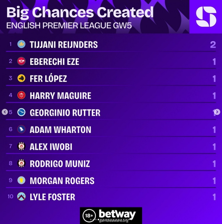 9月24日讯 英超第5轮战罢,squawkafootball列各项数据排行,免费欧洲杯直播赖因德斯共创造2次重大机会,本轮最多。