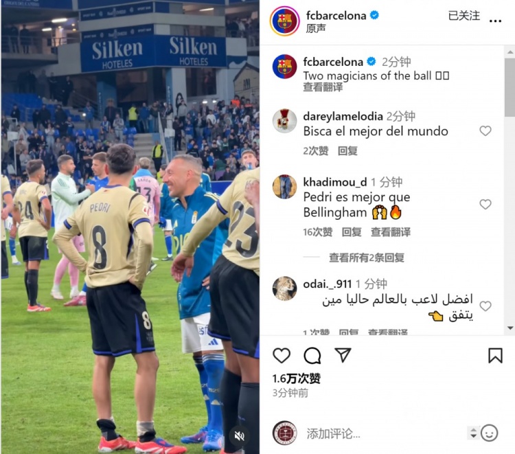巴萨中场球员佩德里赛后与皇家奥维耶多40岁中场球员卡索拉沟通 ,足球直播无插件免费在线观看巴萨官方社媒晒出视频,配文:“两位运动活动 场 魔术师。”