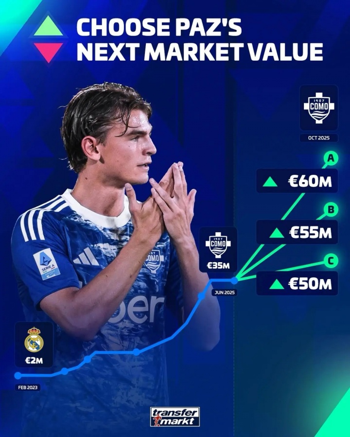 两年前在皇马仅200万欧,德转预热尼科-帕斯身价:最高达6000万欧
