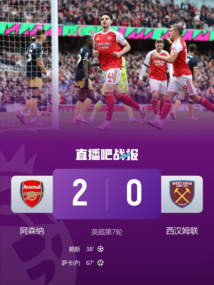 登顶!阿森纳2-0西汉姆 赖斯破旧主+伤退萨卡点射厄德高伤退