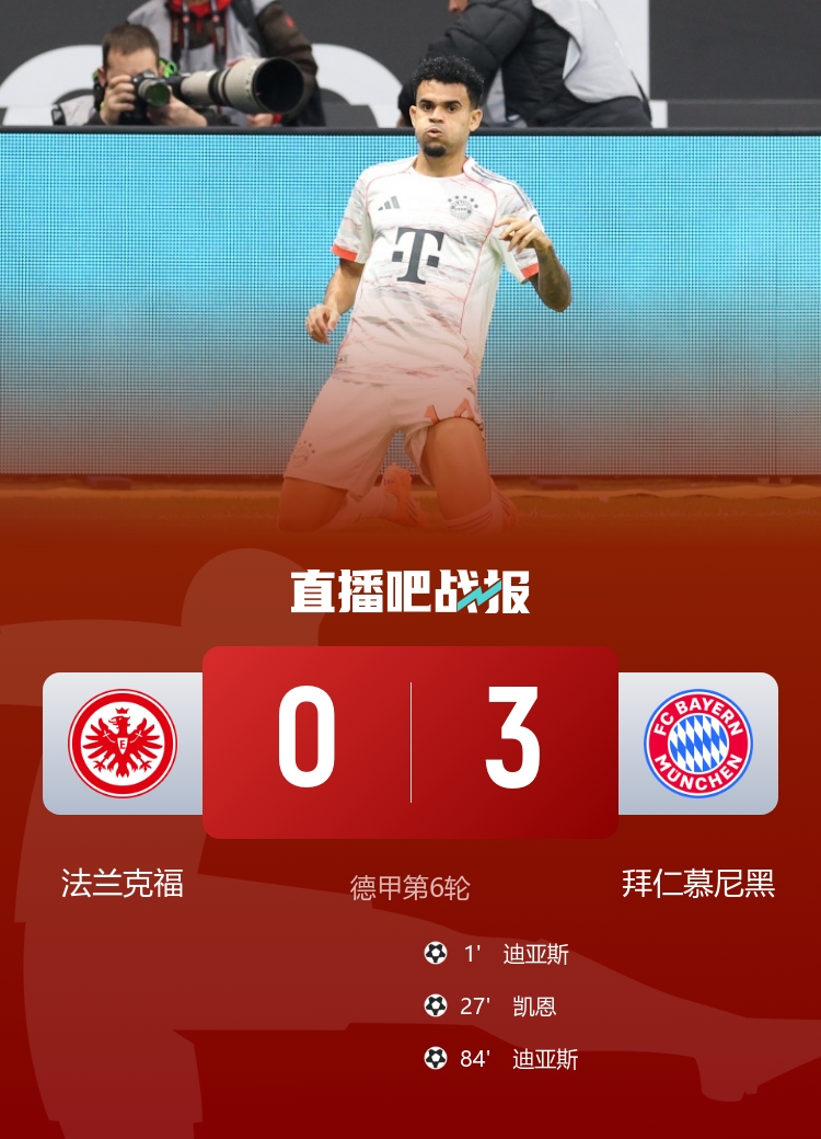 拜仁3-0法兰克福开赛全胜4分领跑 路易斯-迪亚斯两射一传凯恩破门