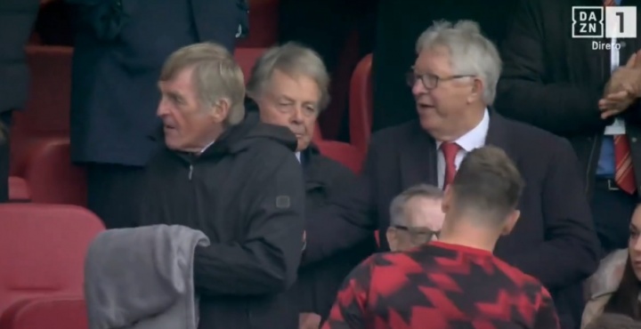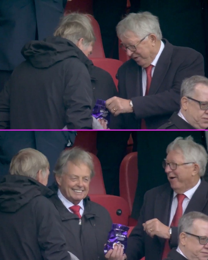 10月20日讯 曼联vs利物浦下半场,镜头给到看台上,欧洲杯直播吧弗格森在看台上分享巧克力给达格利什,此时比分曼联1-0领跑 !