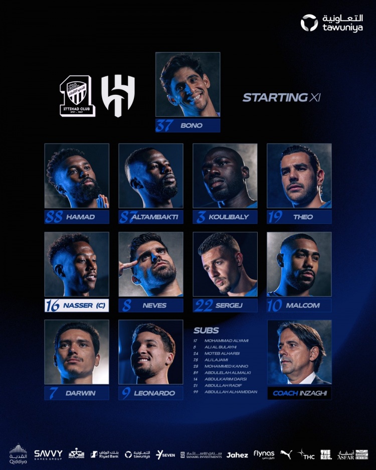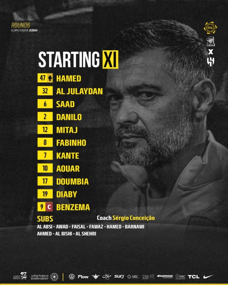 吉达联合杆位:47-哈麦德、32-朱莱丹、6-萨德-穆萨、2-达尼洛、12-米塔赫、8法比尼奥、7-坎特、10-奥亚尔、17-敦比亚、19-迪亚比、9-本泽马