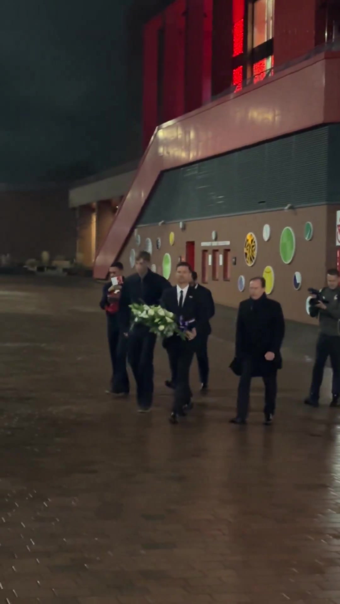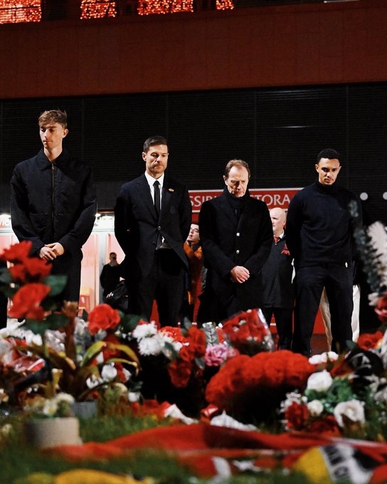 11月4日讯 北京时间周三凌晨的欧冠职业联赛 阶段第4轮赛事 ,皇马将在安菲尔德应战 利物浦。本场赛事 之前,皇马主帅阿隆索、后场球员赫伊森和阿诺德、公关总监布特拉格诺一行来到若塔纪念碑前,阿隆索献上鲜花向这名7月因车祸不幸离世的利物浦前场球员表达敬意。