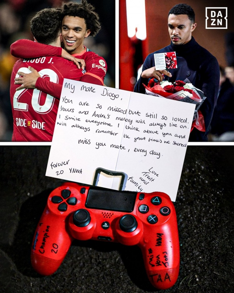 11月4日讯 英格兰右后场球员阿诺德本轮欧冠随皇马客战老东家利物浦,赛前,阿诺德在前队友若塔的纪念碑前留下卡片。