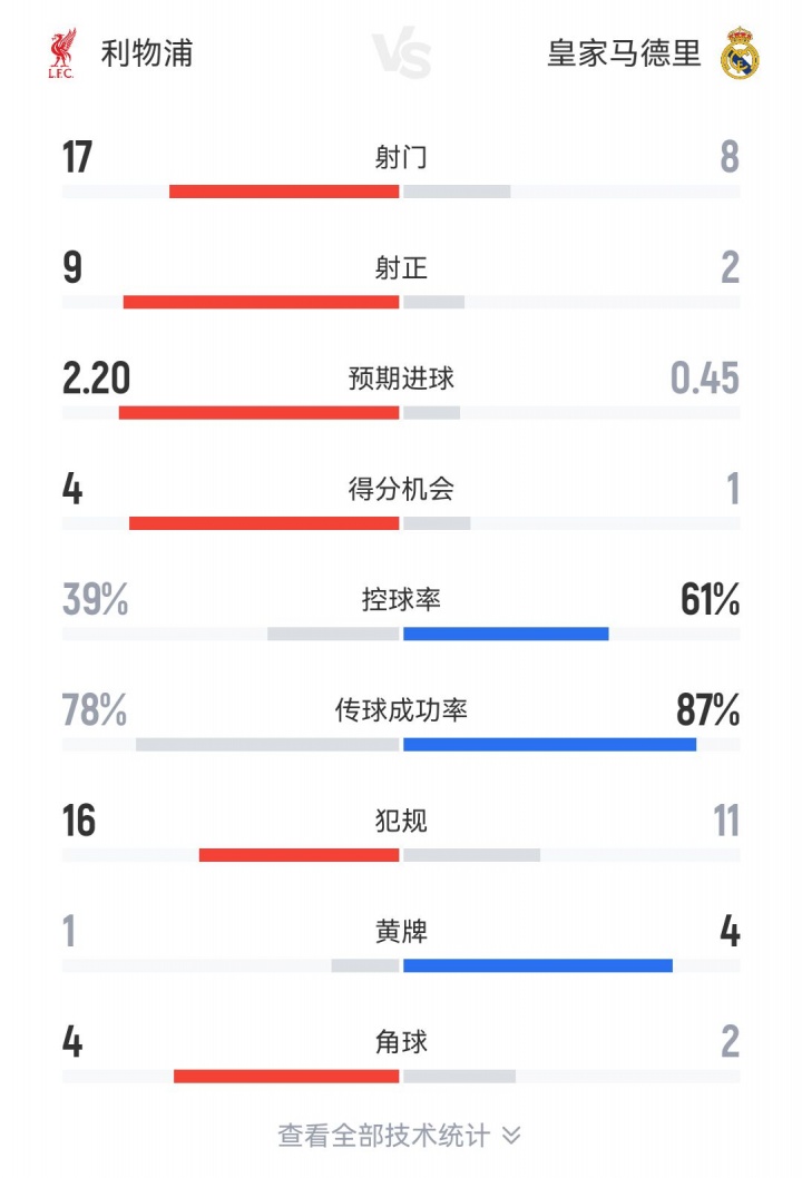 11月05日讯 欧冠第4轮英超比赛在线,足球直播无插件免费在线观看利物浦主场作战 1-0战胜皇马。全场数据如下: