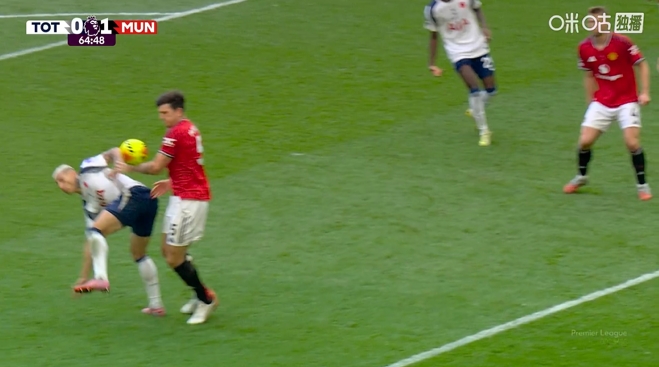 11月08日讯 英超第11轮,热刺vs曼联,赛事 第65分钟,足球直播无插件免费在线观看马奎尔在危险区域 内手臂触球,但裁判 没有表示,VAR也没有介入。