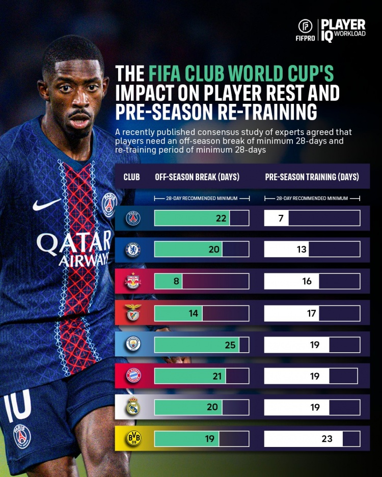 FIFPRO晒上赛季末多家俱乐部球员休息时间、季前练习 时间: